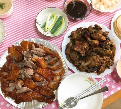 網路上很多人推薦的阿石北平烤鴨店,從門口就能看到櫃檯吊著一隻只的鴨,看了就讓人口水直流。用傳統炭火每天現烤的烤鴨,表皮變成漂亮的焦糖色,肉質也變得鮮嫩多汁,拿上一片荷葉餅把鴨肉、青蔥段和一點甜麵醬包在一起,一口咬下鴨肉油脂、脆皮的多重口感,真的是大滿足!